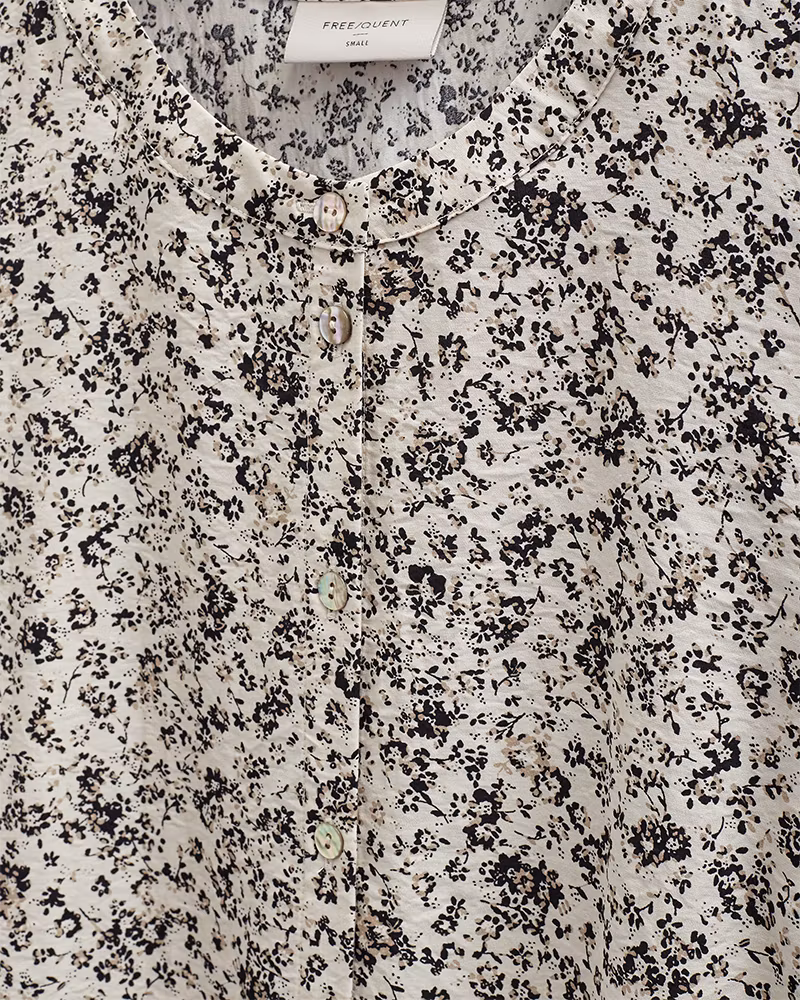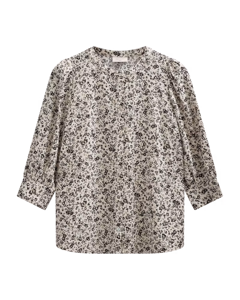 Skjorta i ett lätt material med blommigt tryck. Skjortan har trekvarts ballongärmar med smockmanschetter, pärlemorknappar framtill, fina veck baktill och en elegant, lös passform. Bakgrund i beige och svart mönster.
