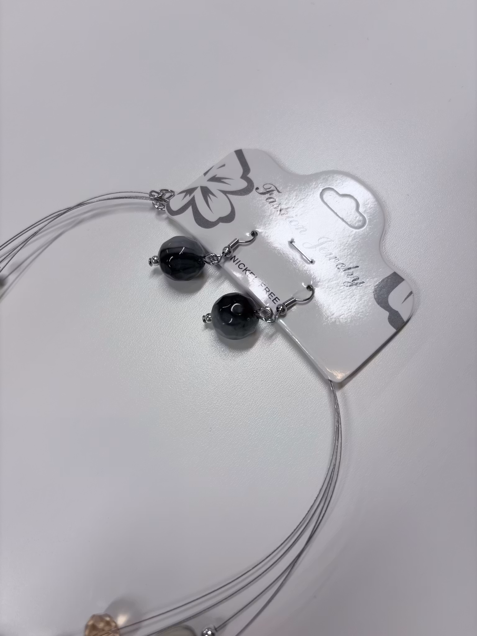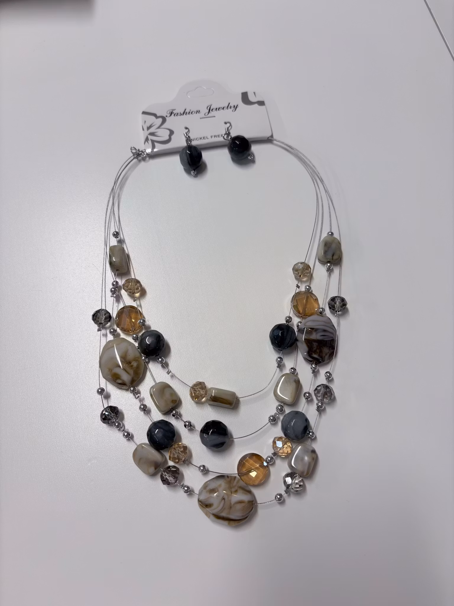Ett elegant och modernt halsband med flera tunna metalltrådar dekorerade med pärlor och kristaller i nyanser av vitt, beige och grått. Den stilrena färgkombinationen gör halsbandet lätt att matcha med både vardags- och festkläder.
