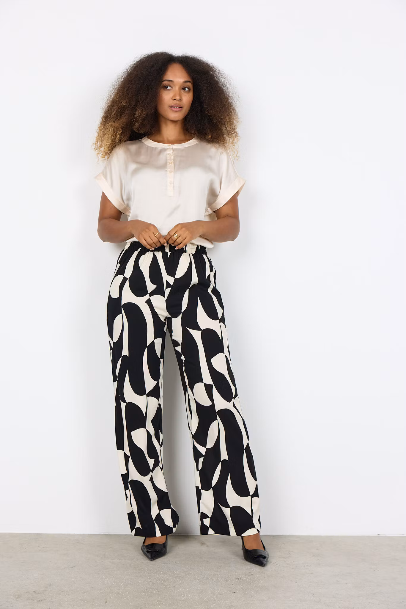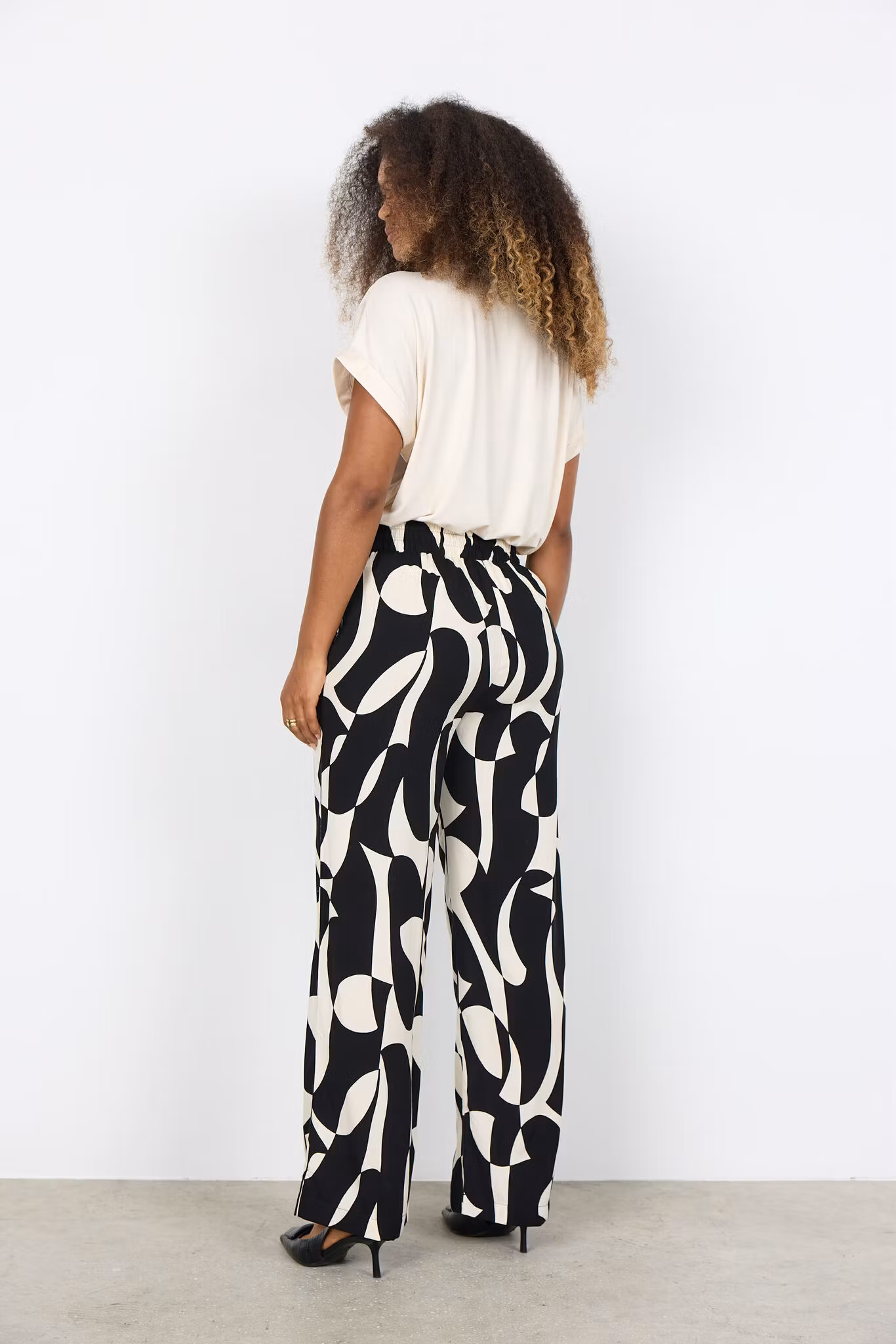 Den moderna, avslappnade passformen tillsammans med det trendiga svartvita mönstret skapar en sofistikerad look som enkelt kan matchas med både enkla toppar och mer uppklädda plagg. Byxorna passar lika bra till kontoret som till semestern eller en middag på stan.
