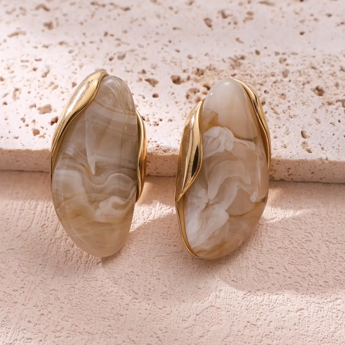Dessa guldpläterade örhängen i rostfritt stål kombinerar modern design med tidlös elegans. Den långsträckta ovala formen framhäver en vacker marmorerad harts i djupa, sofistikerade nyanser. Den dekorativa vågiga guldkanten skapar en exklusiv och samtida look som gör örhängena till ett perfekt smycke både till vardag och fest.