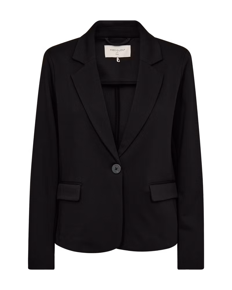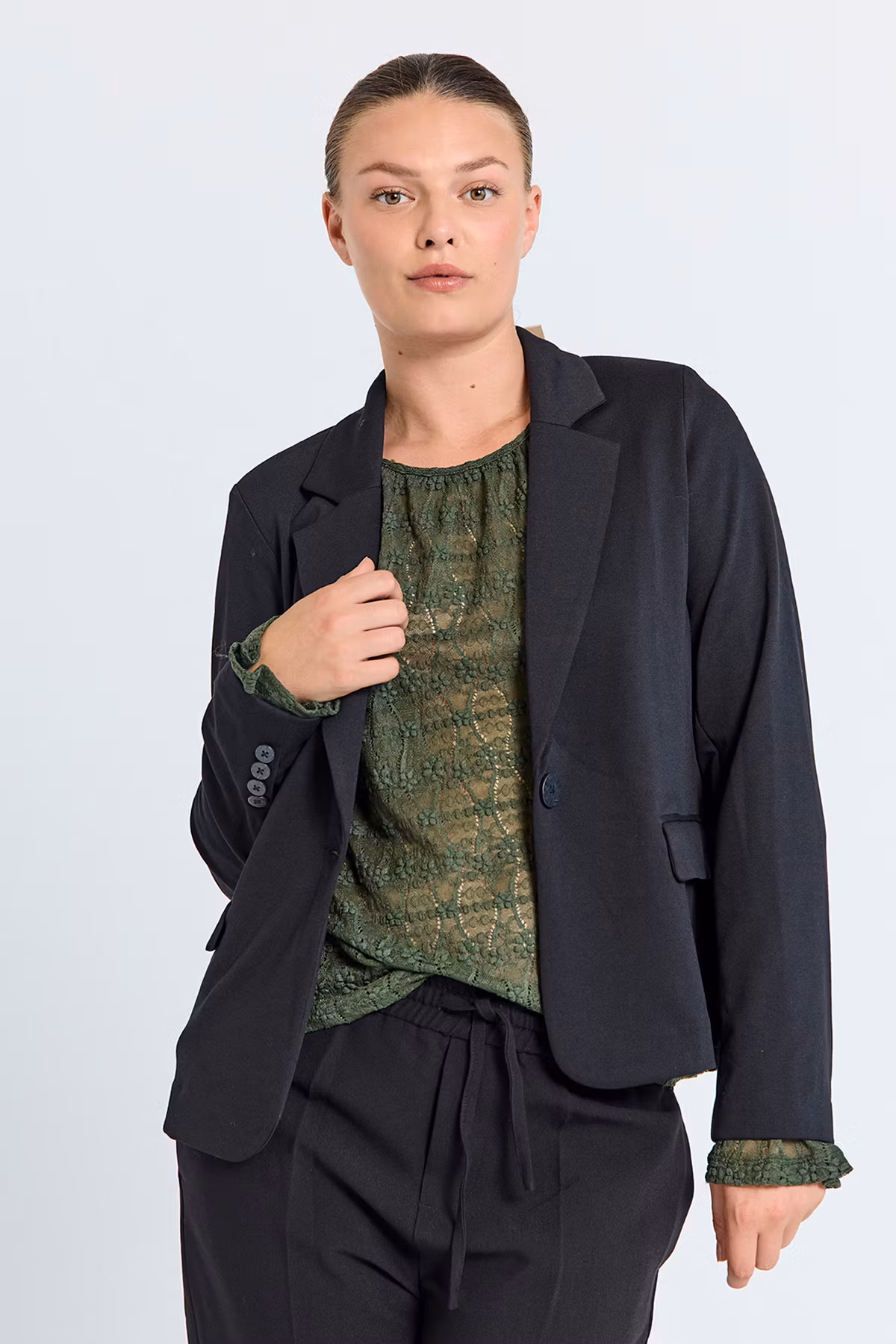 Kavaj i ett mjukt och stretchigt material. Kavajen har en enkel siluett med långa ärmar, V-ringning med slag, knappknäppning, sidfickor och en figurnära passform.