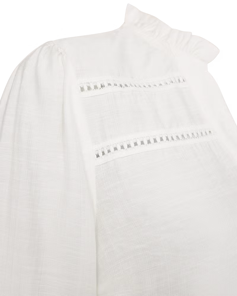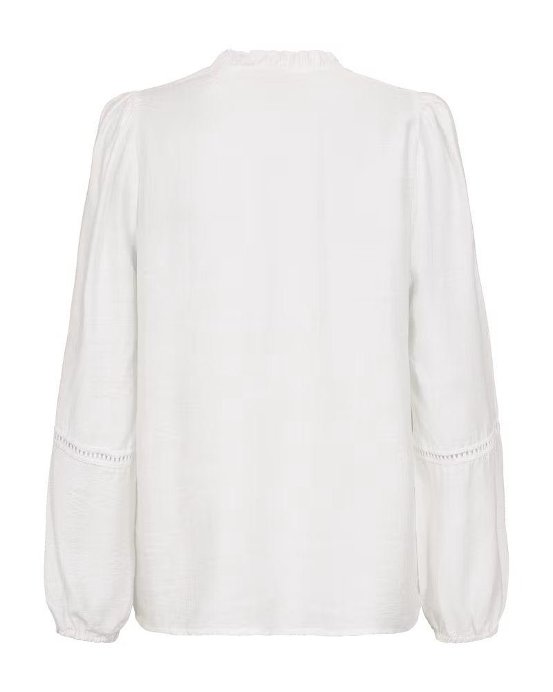 Blus i ett mjukt material. Blusen har långa ballongärmar med resår i mudden, en V-ringning med volang, en lös passform och en spetsinsats som ger en fin touch av huden.