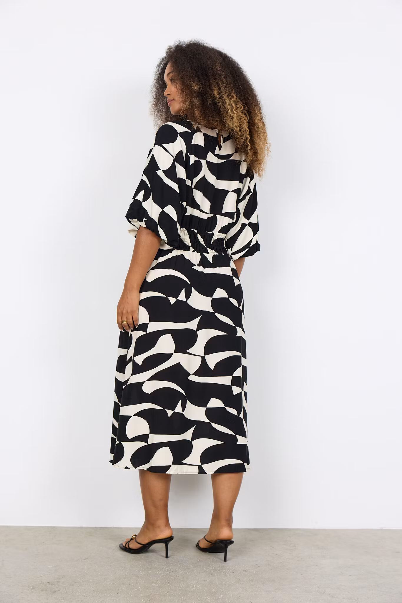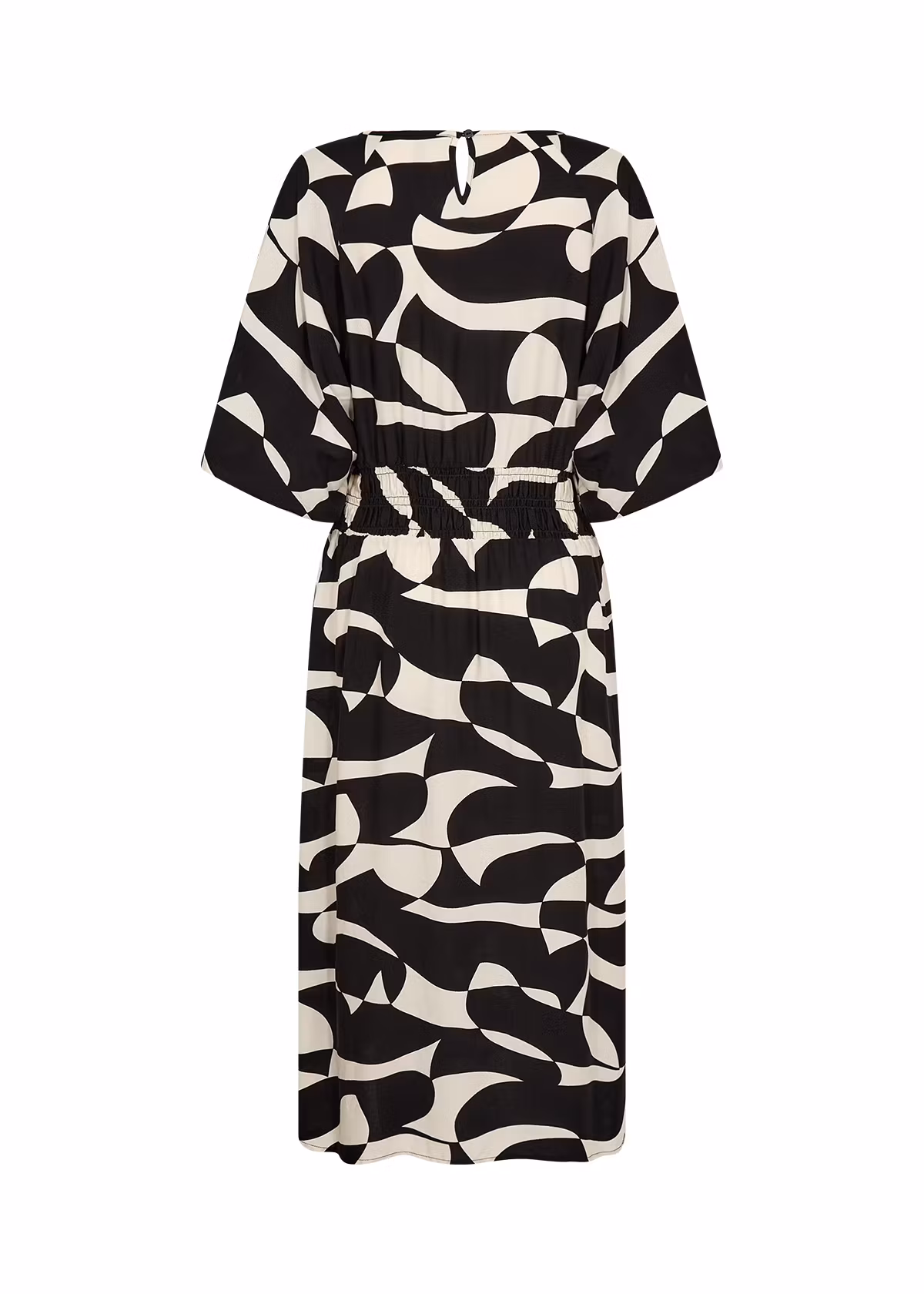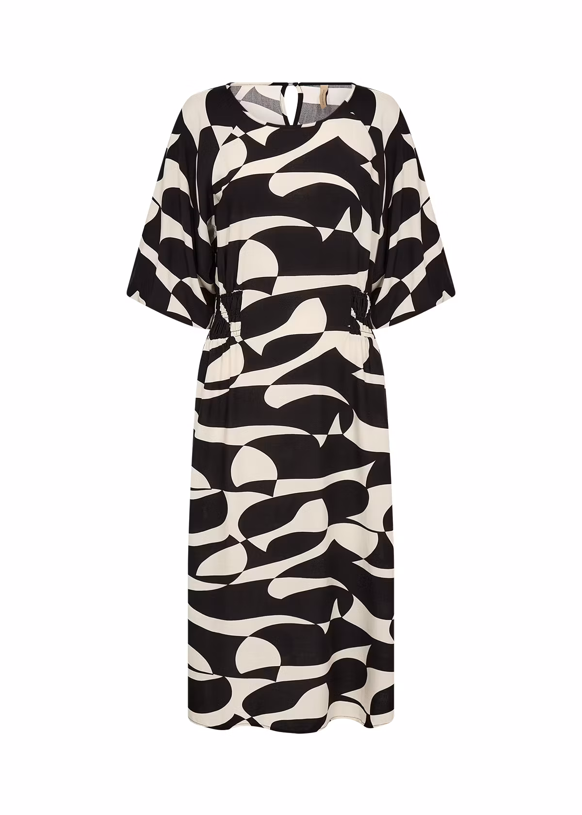 Den har en rund halsringning, korta ärmar och ett slående abstrakt tryck som ger en djärv touch. Klänningen har en smock i sidorna och rygg. Kombinera denna unika klänning med neutrala sandaler eller snygga flats för en stilfull look.