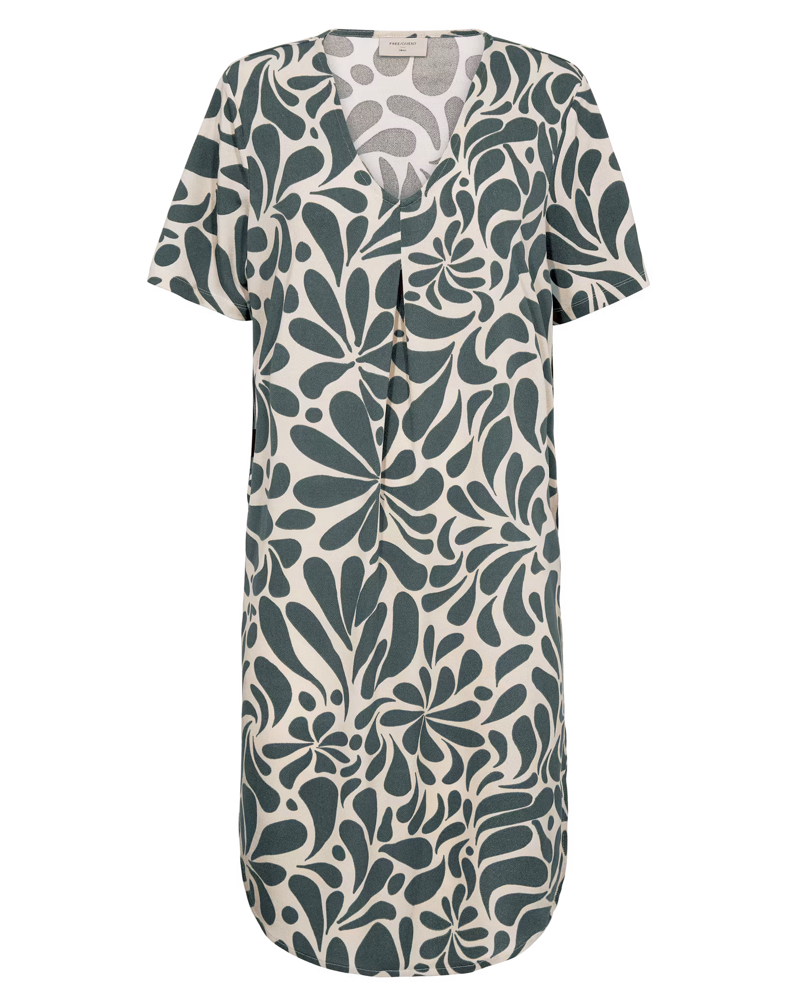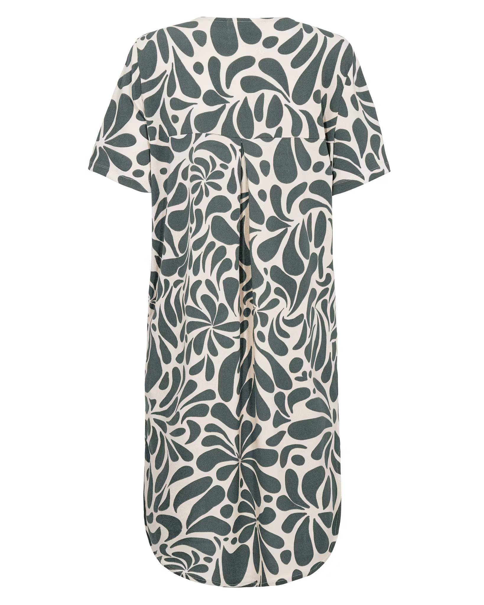 Denna stilrena klänning kombinerar komfort och elegans i en tidlös design. Klänningen har en mjukt A-linjeformad silhuett som faller ledigt längs kroppen och ger en smickrande passform. Det diskreta men levande mönstret i grönt och vitt skapar ett harmoniskt och naturinspirerat uttryck som passar lika bra till vardag som till mer uppklädda tillfällen.