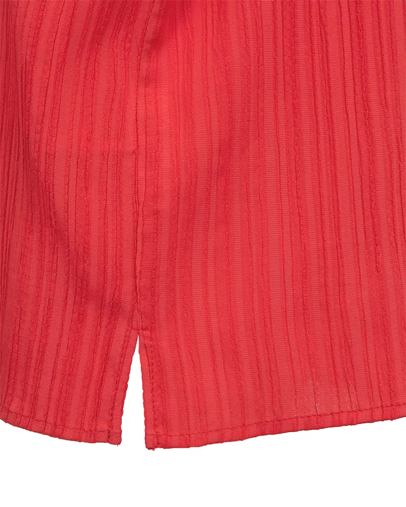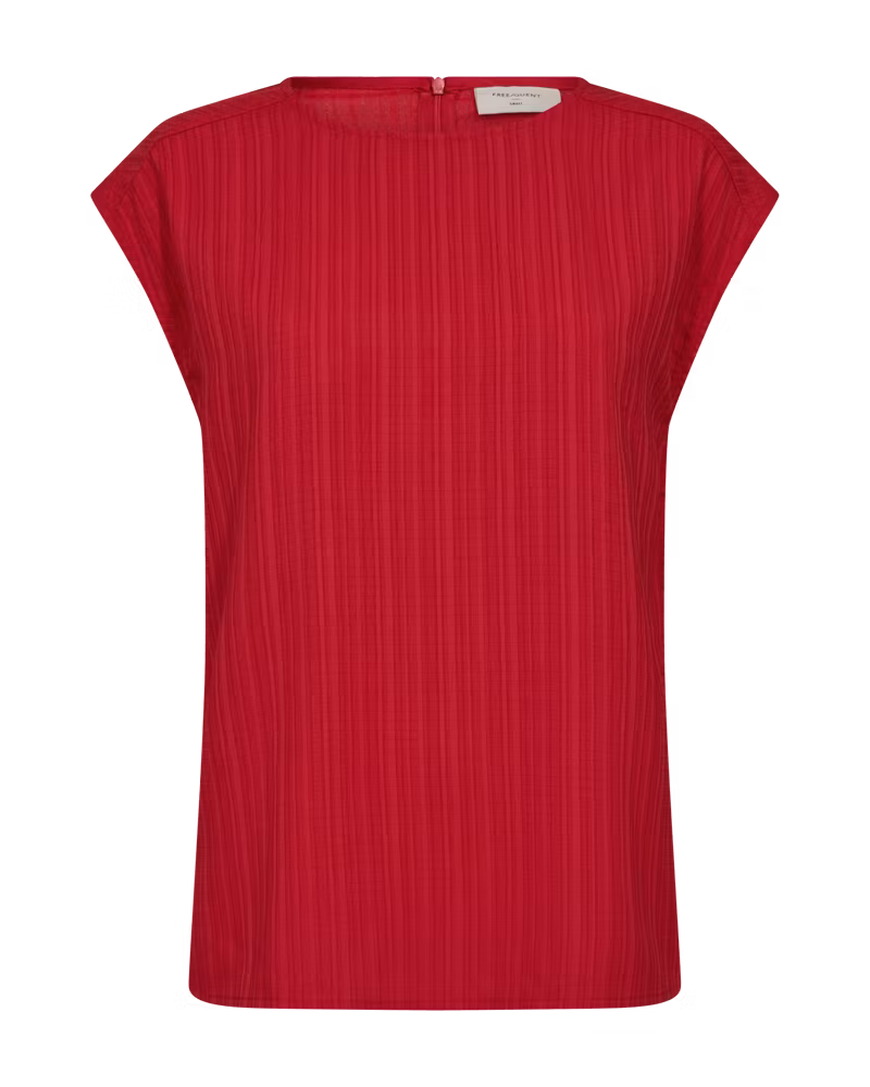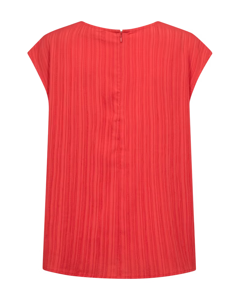 Blus i ett lätt material med ett strukturerat mönster. Blusen har en enkel silhuett med rundad halsringning, korta ärmar och en dold dragkedja i nacken.