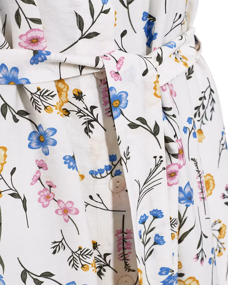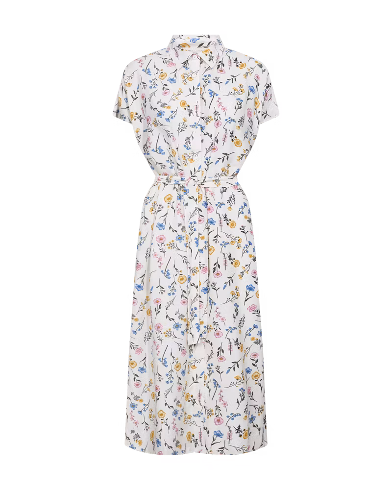 Den perfekta skolavslutning- och midsommarklänningen från Freequent. Kort holkärm, liten skjortkrage. Knäppning hela vägen, samt ett band du kan sätta i midjan eller varför inte i håret? Tyget har små fina blommor i rosa, gult och blått på gröna stjälkar.