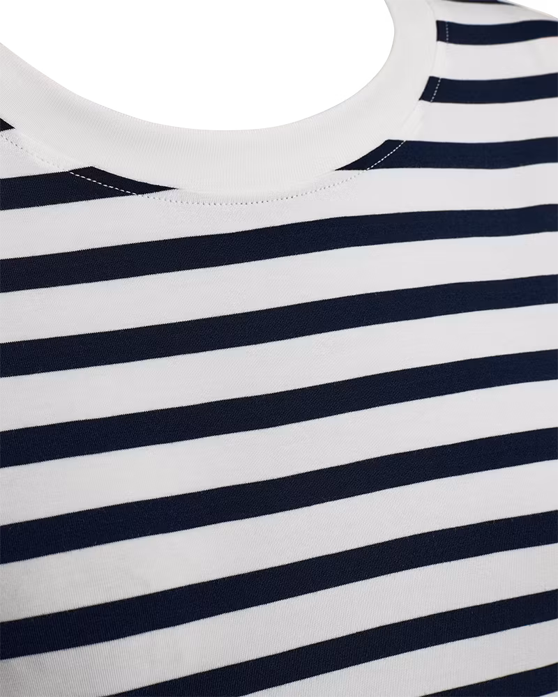 Uppdatera garderoben med en stilren och bekväm vit och blå randig T-shirt som kombinerar trendig design med fantastisk komfort. Den mjuka kvaliteten i modal och elastan ger ett följsamt tyg med lyxig känsla mot huden samtidigt som materialet andas och håller formen hela dagen.