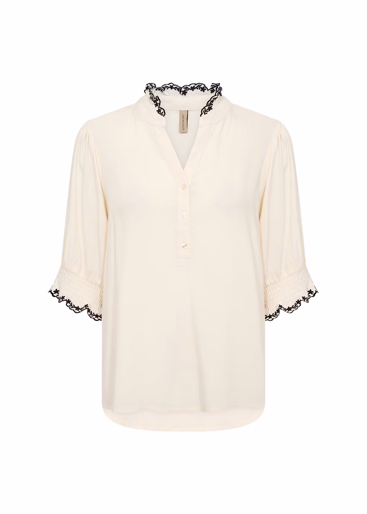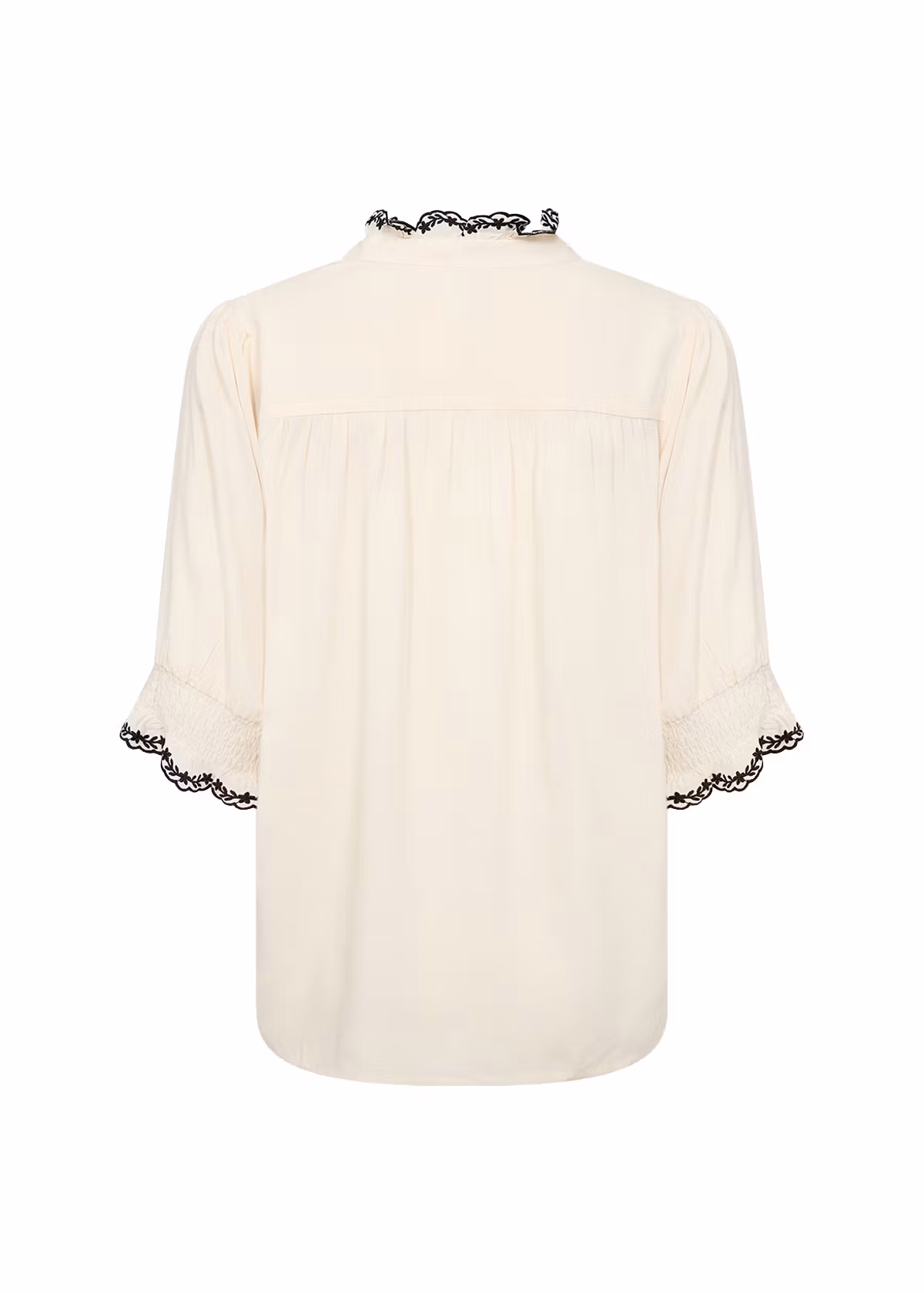 Den har en elegant volangkrage med fint broderi på runt halsen och armarna. Smock längst ner på ärmarna.