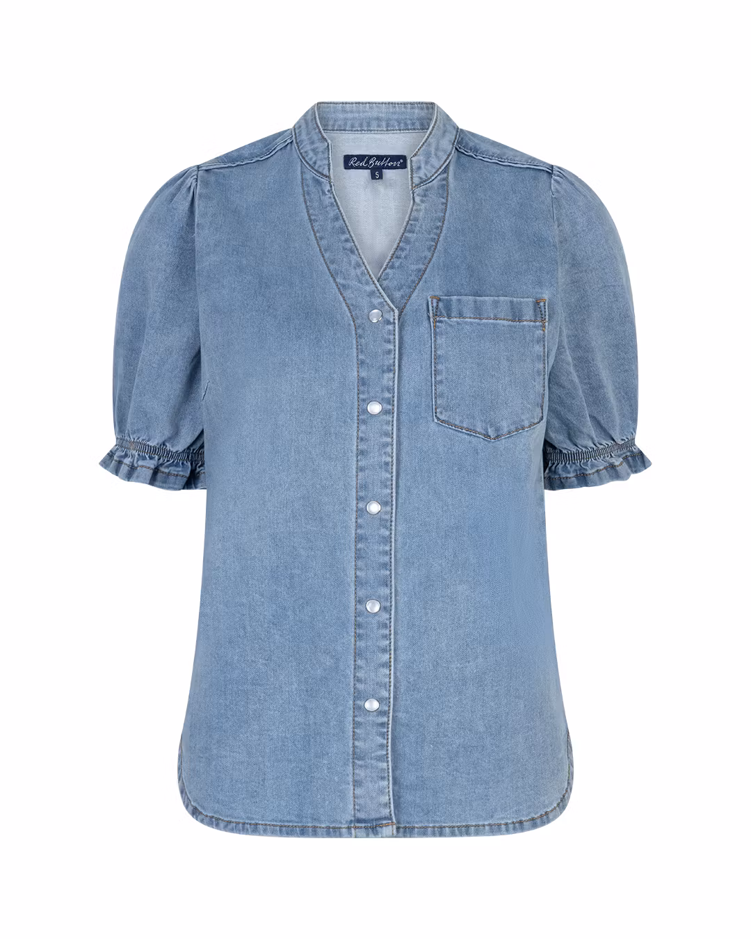 Blus från Red Button med v-ringning i mjukt denimtyg med knäppning med knappar. Ärm precis ovanför armbågen med reså. Liten ficka på Vänstersida på bröstet. Red button använder bomull som framställs av bomull som är odlad med 50% mindre vatten.